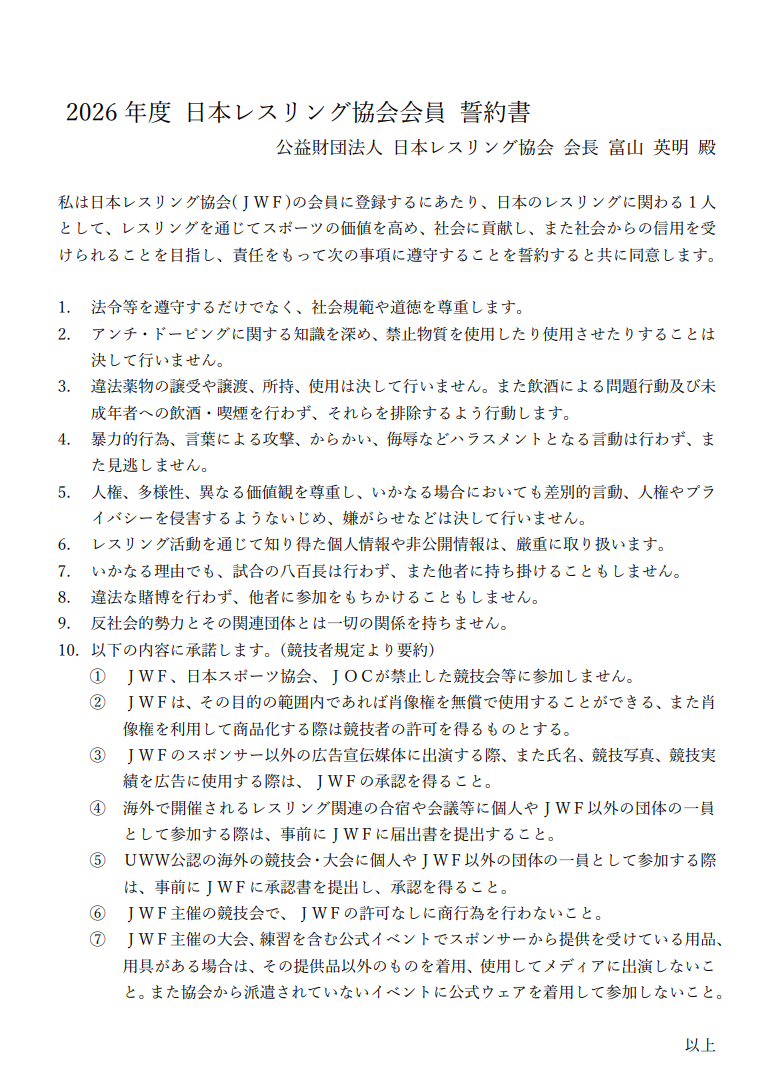 【ここをクリックでダウンロード】2026年度日本レスリング協会会員 誓約書